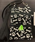 Zippered compartment for your cell phone on the top, pouch just below for a regular size bottle of water, grommet with poop bags and carabiner on the side for your keys. Can be worn crossbody or fanny pack style